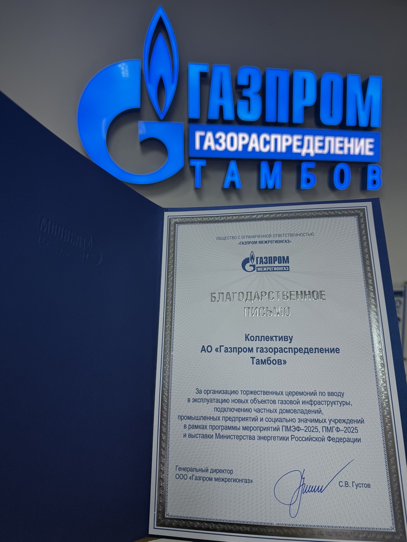 Коллектив «Газпром газораспределение Тамбов» отмечен благодарственным письмом от имени генерального директора ООО «Газпром межрегионгаз» Сергея Густова за организацию торжественных церемоний по вводу в эксплуатацию новых объектов газовой инфраструктуры в рамках программы мероприятий ПМЭФ-2025, ПМГФ-2025 и выставки Министерства энергетики Российской Федерации. Награду вручил заместитель генерального директора по управлению персоналом и общим вопросам ООО «Газпром межрегионгаз» Сергей … Читать далее Коллектив «Газпром газораспределение Тамбов» награжден благодарственным письмом